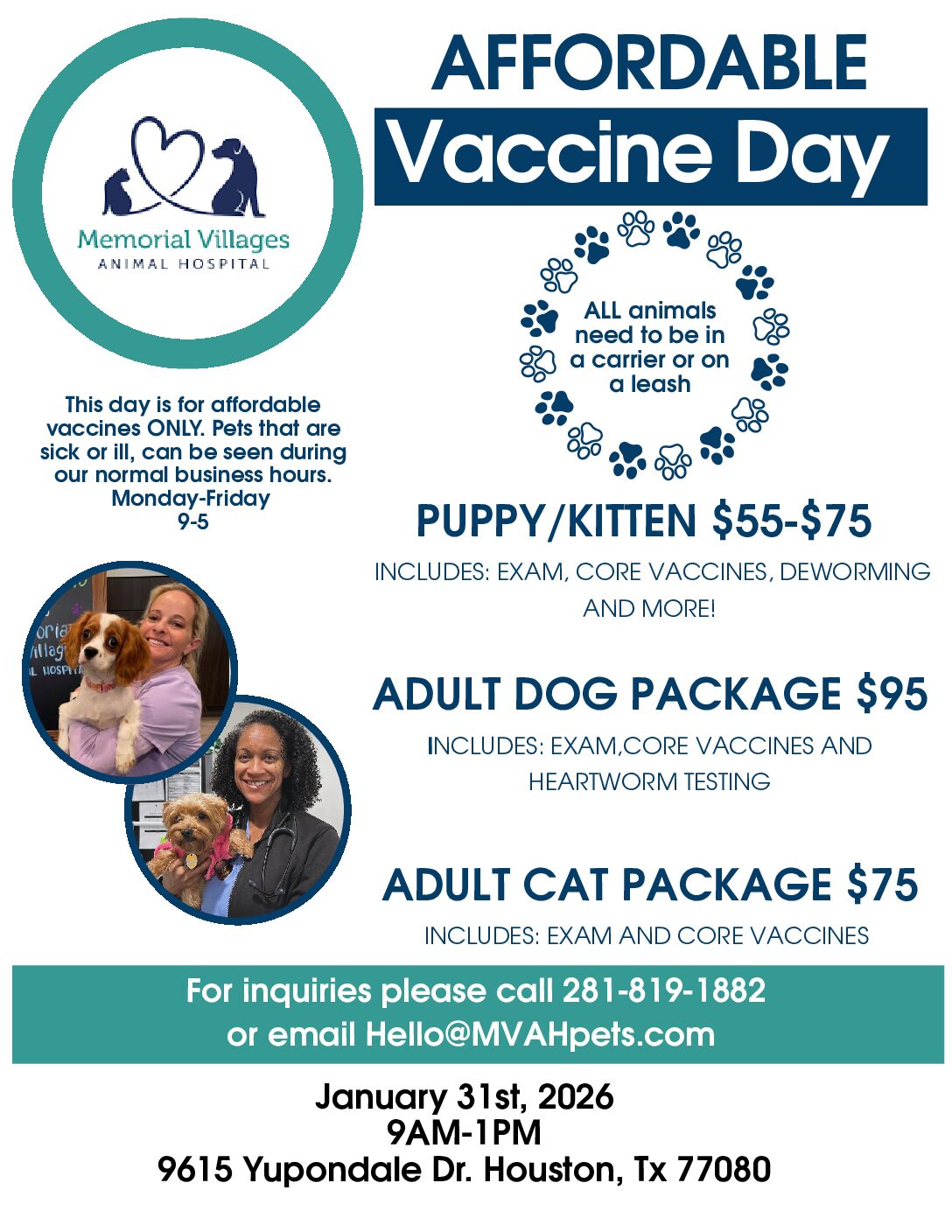 Memorial Villages Animal Hospital is excited to offer low cost vaccines to our Houston community once a month. The low-cost vaccine pet clinic is a golden opportunity for pet owners to access affordable vaccinations that safeguard their furry friends against preventable diseases! Let’s seize the moment, advocate for affordable pet healthcare, and make a positive impact in the lives of our pets and our communities!